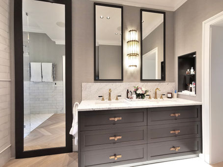 Et plassbygd baderom i mørk grå kulør med hvit Carrara marmor benkeplate og underlimt vask. Innredningen har Basic fronter med antikkmessing knotter og trehulls blandebatteri. En lang speilramme flankeres av smale speil og vegglampe, mens LED‑belysning i sokkel gir stemning og funksjon i rommet. Dette skreddersydde badet har også integrert oppbevaring og tidløst preg.