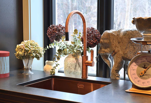 Dette plassbygde grovkøkkenet kombinerer en drikkestasjon og vinskapseksjon med Nero Memorial Honed Granite-benkeplate. Tapwell TA5040-kobbervasker og EVO078-armaturer bryter mot den mørke stenen og skaper et varmt uttrykk. Uttrekkbare hyller, innvendige skuffer og gjennomtenkte løsninger gjør kjøkkenet praktisk og elegant. Oslo-håndtak fra Lovehandles og smart organisering gir oversikt. Det er et perfekt rom for matlaging, servering og oppbevaring.